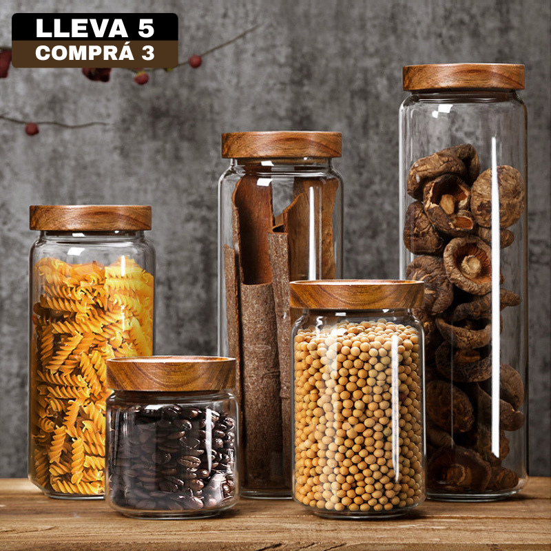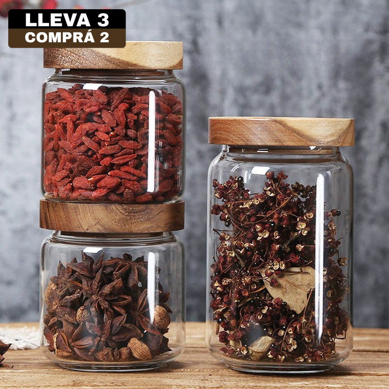 Cada pote está creado con vidrio de alta calidad y tapas de madera tratada, pensados para resistir el paso del tiempo. Nada de plásticos baratos: solo materiales nobles que acompañan tu día a día.