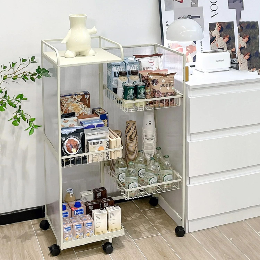 El frente estriado translúcido mantiene la privacidad visual sin perder elegancia. El marco metálico en tono crema se integra perfecto con estilos nórdicos o minimalistas. El asa superior facilita el manejo diario: lo llevás de la cocina al baño en un segundo.